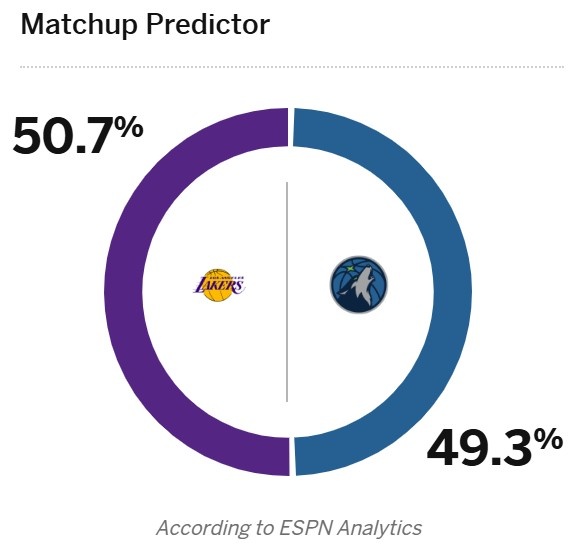 湖人1-2落后!ESPN预测G4胜率:湖人50.7%略占优势 森林狼49.3%